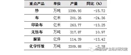 其他主要紡織產(chǎn)品化纖、紗、布和服裝產(chǎn)量同比分別減少2.38%、15.72%、24.36%和13.42%,除化纖產(chǎn)量增速比1~6月下降1.4個(gè)百分點(diǎn)外,紗、布和服裝產(chǎn)量降幅較1~6月分別收窄0.08、1.57和0.27個(gè)百分點(diǎn)。