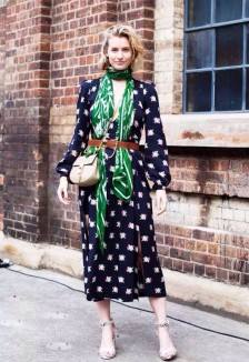 素色衣服搭配印花絲巾。最根本的指導(dǎo)原則就是絲巾上至少要有一個(gè)顏色和衣服的色彩相同。