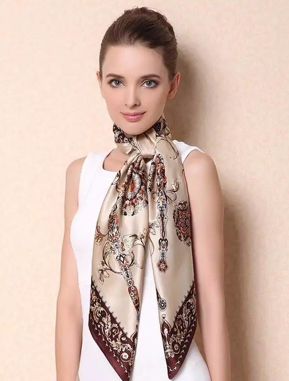 將一條富有華麗氣息的大方巾對(duì)角折疊,平貼胸部繞于背后,在尾部松松打個(gè)結(jié),細(xì)心整理好需要的造型。需要注意的是,搭垂胸前的絲巾應(yīng)松緊適宜,以能插入一只手掌為最佳狀態(tài),顏色不可過(guò)分鮮艷,面料、質(zhì)地需柔軟、蓬松,呈現(xiàn)給眾人優(yōu)雅嫵媚的女性氣息。