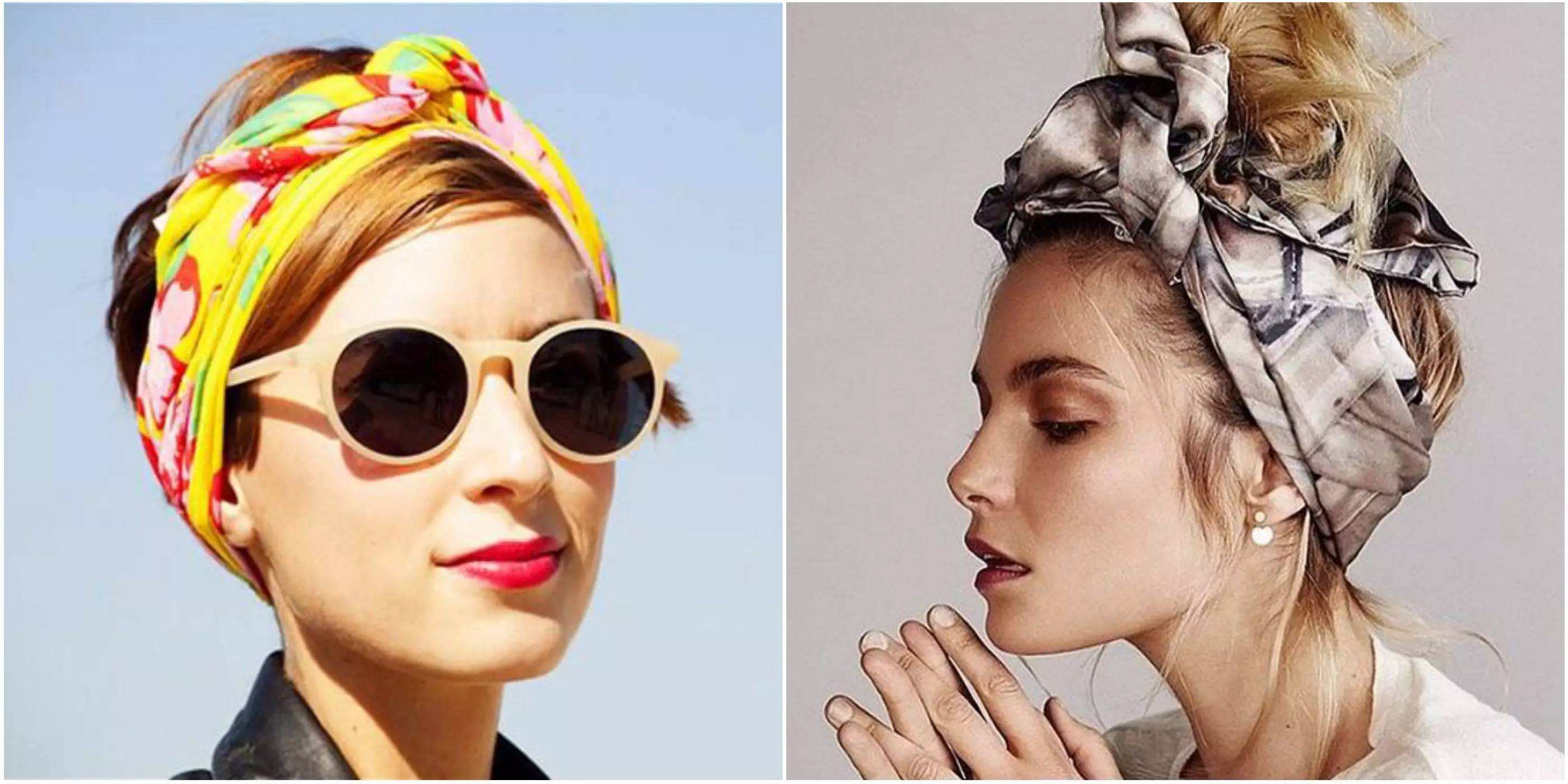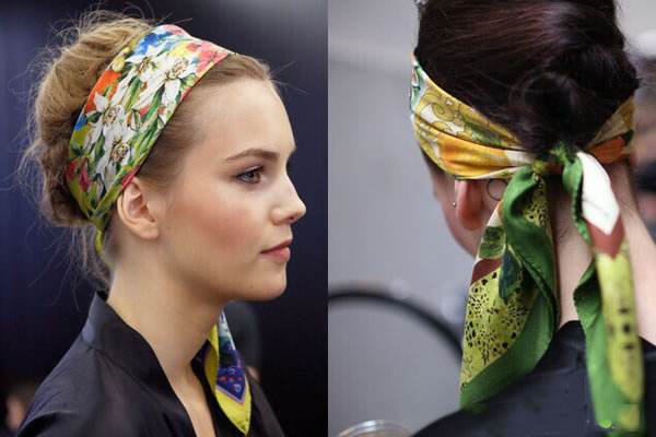 將絲巾對(duì)折成大三角,裹住頭部及前額的一部分,兩角在頸后交叉打結(jié),再次交叉后系好,整理造型,讓秀發(fā)同絲帶一起自然下垂。