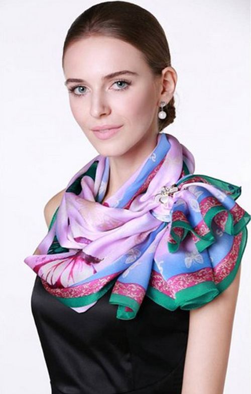 將小方巾對(duì)角折成三角形,露出搭在肩部的兩邊角,然后在胸前打一個(gè)蝴蝶結(jié),展開(kāi)花形,把結(jié)稍稍隱藏。如果想用一個(gè)漂亮的絲巾扣作點(diǎn)綴,則應(yīng)選用長(zhǎng)條絲巾,遠(yuǎn)遠(yuǎn)看去宛若翩翩起舞的花蝴蝶,更為領(lǐng)子較低的上裝起到巧妙的補(bǔ)充作用。