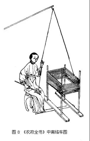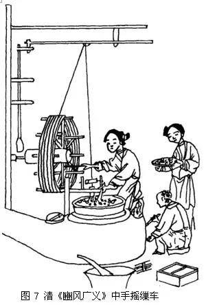 繅車發(fā)明以前,繅絲時的繞絲工具,最初大概只是簡單的H型架子,戰(zhàn)國時改進成轆轤式的繅絲軖〔kuang框〕??壗z軖是手搖繅車的雛形,用竹制成,四角或六角,用短輻交互連接,中貫以軸,使用時放在繅釜上面,用時直接拔動使之不斷回轉(zhuǎn),將繅釜中引出的絲條,直接纏繞在軖框上。秦漢以后,成形的手搖繅車才出現(xiàn)。唐代手搖繅車的使用已相當(dāng)普遍,唐詩中就曾多處出現(xiàn)過繅車的記載,如陸龜蒙詩句“每和煙雨掉(搖)繅車”,描述了陰雨天里繅婦忙著搖動絲車的勞動情景;王建詩句“檐頭索索繰(繅)車鳴”,講繅車轉(zhuǎn)動后發(fā)出索索之鳴響。宋代手搖繅車得到進一步完善,并出現(xiàn)了有關(guān)具體形制的記載,其制據(jù)秦觀《蠶書》介紹,系由灶、鍋、錢眼(作用是合并緒絲)、鎖星(導(dǎo)絲滑輪,并有消除絲縷上纇〔lei類〕節(jié)的作用)、添梯(使絲分層卷繞在絲框上的橫動導(dǎo)絲桿)、絲鉤、絲軖、車架等部分組成??壡埃殞⒗O鍋里的絲先穿過集緒的“錢眼”,繞過導(dǎo)絲滑輪“鎖星”,再通過橫動導(dǎo)絲桿“添梯”和送絲鉤,繞在絲軖上。繅時,須兩人合作,一人投繭索緒添緒,一人手搖絲軖。元代初年,生產(chǎn)效率遠較手搖繅車高出許多的腳踏紡車開始普及,手搖繅車在各地的使用日漸減少,但由于它結(jié)構(gòu)簡單,易于操作,有的地方仍在沿用,故清代《豳風(fēng)廣義》和《蠶桑萃編》兩書,仍把手搖繅車作為一種有效的繅絲工具予以介紹(圖7)。