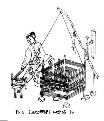 絡(luò)車是將繅車上脫下的絲絞轉(zhuǎn)絡(luò)到絲籰上的機具,它有南北絡(luò)車之分(圖8、圖9)。關(guān)于絡(luò)車的記載,《方言》有“河濟之間,絡(luò)謂之給”。郭璞注“所以轉(zhuǎn)籰給事也”?!墩f文》有“車柎〔fu膚〕為柅〔ni你〕”?!锻ㄋ孜摹酚小皬埥z曰柅”。這里的“柅”南北絡(luò)車通用,是張絲絞的裝置,由豎立地面上的四根木棍,或者由每兩根一組下裝底座的木棍組成。王禎《農(nóng)書》對北絡(luò)車的構(gòu)造和用法記載得比較詳細,其文譯成白話是:將繅車上脫下的絲膠,張于“柅”上,“柅”上作一懸鉤,引絲緒過鉤后,逗于車上。其車之制,是以細軸穿籰,放于車座上的兩柱之間。兩柱一高一低,高柱上有一通槽,放籰軸的前端,低柱(上有一孔)放籰軸的末端。繩兜繞在籰軸上,手拉繩一引一放,則籰軸隨轉(zhuǎn),絲于是就絡(luò)在籰上了。宋應(yīng)星《天工開物》則對南絡(luò)車的構(gòu)造和用法記載得較具體,其文譯成白話是:在光線好的屋檐下,把木架鋪在地上,木架上插四根竹竿,名叫“絡(luò)篤”。絲套在四根竹上。絡(luò)篤旁邊的立柱上八尺高處,斜安一小竹竿,上面裝一個月牙鉤,絲懸掛在鉤內(nèi)。手拿籰子旋轉(zhuǎn)繞絲,以備牽經(jīng)卷緯時用。小竹竿的一頭墜石,成為活頭,接斷絲時,一拉繩小鉤就可落下。對比兩書記載,南北絡(luò)車都用張絲的“柅”和卷繞絲線的“籰”,但絲上籰的方式兩者卻是大不相同。北絡(luò)車是用右手牽繩掉籰,左手理絲,繞到籰上;南絡(luò)車則是用右手拋籰,左手理絲,繞到籰上。由于北絡(luò)車轉(zhuǎn)籰動作采取了機械方式,絲籰旋轉(zhuǎn)速度快而穩(wěn),所以它的生產(chǎn)效率和絡(luò)絲質(zhì)量遠較南絡(luò)車為優(yōu),古人所謂“南人掉籰取絲,終不若絡(luò)車安而穩(wěn)也”的評論,正是對此而言。