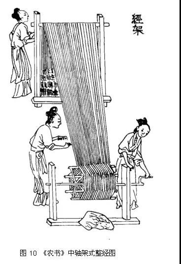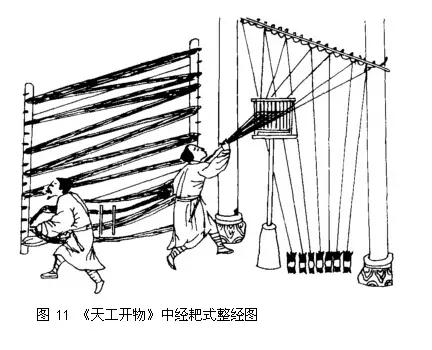 軸架式整經(jīng)工具始見于樓璹〔shu贖〕《耕織圖》中,那上面所載圖文雖過于簡單,但表明至晚在南宋時就已普遍使用這種整經(jīng)工具了。其后元代的《農(nóng)書》、明代的《農(nóng)政全書》、清代的《豳風(fēng)廣義》等一些書籍記載得較為詳盡,使我們可以知道它的全貌。根據(jù)這些記載,軸架式整經(jīng)是將絲籰整齊排列在一有小環(huán)的橫木下,引出絲緒穿過小環(huán)和掌扇繞在經(jīng)架上(經(jīng)架的形制是兩柱之間架一大絲框,框軸固連一手柄)。一人轉(zhuǎn)動經(jīng)架上手柄,一人用掌扇理通紐結(jié)經(jīng)絲,使絲均勻地繞在大絲框上后,再翻卷在經(jīng)軸上(圖11)。這種經(jīng)具與經(jīng)耙式相比,不僅產(chǎn)量高、質(zhì)量有保證,而且對棉、毛、絲、麻等纖維都適用,故一直習(xí)用至近代。它的工作原理與近代大圓框式的自動整經(jīng)機完全一致。