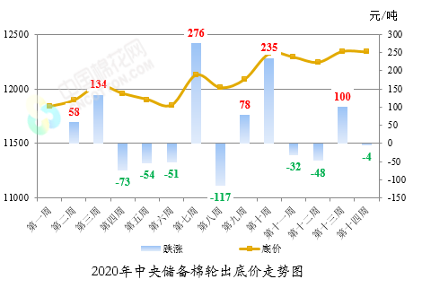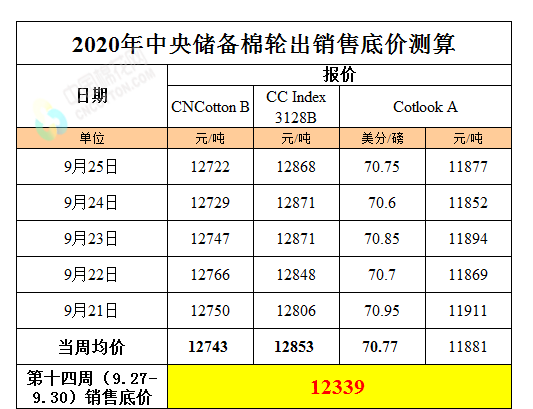 中國棉花網(wǎng)專訊:根據(jù)國家糧食和物資儲(chǔ)備局中華人民共和國財(cái)政部公告(2020年第1號(hào))對(duì)中央儲(chǔ)備棉輪出銷售底價(jià)計(jì)算公式,第十四周(9月27日-30日)儲(chǔ)備棉輪出銷售底價(jià)為12339元/噸(折標(biāo)準(zhǔn)級(jí)3128B),較前一周下跌4元/噸。