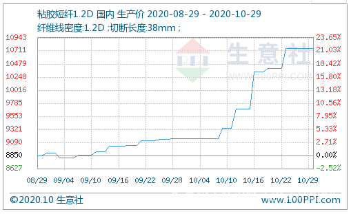 根據(jù)生意社價(jià)格監(jiān)測(cè),截止至10月29日,1.2D*38mm粘膠短纖國內(nèi)地區(qū)出廠均價(jià)為10750元/噸,較10月初上漲1590元/噸,漲幅17.36%,同比下跌3.15%。10月,滌綸短纖上市經(jīng)歷多日漲停,同時(shí)海外紡織訂單輸入以及“雙十一”效應(yīng)的作用下,滌綸短纖價(jià)格一路高歌猛進(jìn),同樣帶動(dòng)了其替代產(chǎn)品棉花、粘膠的熱度,當(dāng)月,皮棉現(xiàn)貨漲幅一度高達(dá)近2000元/噸。