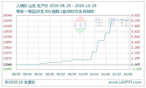 截止至10月29日,山東地區(qū)30S人棉紗出廠均價(jià)為14233元/噸,較10月初價(jià)格上漲1033元/噸,漲幅7.83%,同比下跌13.74%。10月,紡織訂單現(xiàn)“報(bào)復(fù)性”增長,部分服裝廠表示,由于訂單快速增長,國慶期間工廠滿負(fù)荷運(yùn)轉(zhuǎn),排單延長至11月中旬。雙節(jié)歸來,紡織原料大部分調(diào)價(jià)快、漲幅大,甚者議價(jià)僅當(dāng)日有效,且大多表示庫存告急。但臨近月底,搶購熱度消散,新增訂單較少,廠家排單出貨為主,人棉紗報(bào)價(jià)滯漲,市場(chǎng)謹(jǐn)慎看漲,短期多以持價(jià)出貨為主。