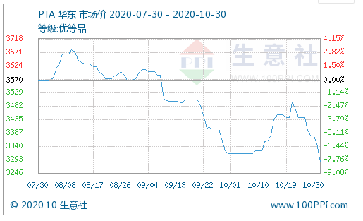 原料PTA市場(chǎng)行情窄幅下跌,截至10月30日市場(chǎng)均價(jià)在3285元/噸,較周初下跌4.54%,同比下跌33.28%。裝置方面檢修與重啟并存,逸盛大化375萬(wàn)噸PTA裝置降負(fù)荷5成且計(jì)劃?rùn)z修,10月31日揚(yáng)子石化35萬(wàn)噸計(jì)劃?rùn)z修,但是10月28日漢邦220萬(wàn)噸PTA裝置重啟、10月30日儀征化纖65萬(wàn)噸計(jì)劃重啟、11月1日恒力石化220萬(wàn)噸計(jì)劃重啟,預(yù)計(jì)下周開(kāi)始PTA開(kāi)工負(fù)荷將回升。另外,獨(dú)山能源二期另外110萬(wàn)噸新PTA產(chǎn)能延期至11月初投放,以及原油下跌,下游聚酯市場(chǎng)產(chǎn)銷平淡,整體利空PTA市場(chǎng)心態(tài)。
