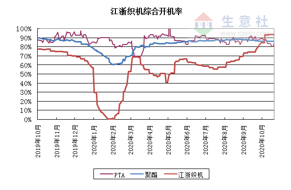 下游方面,因冷冬預(yù)期加上內(nèi)銷采購(gòu)商為“雙11”備貨的利好預(yù)期,國(guó)內(nèi)中國(guó)輕紡城傳統(tǒng)市場(chǎng)的冬季防寒面料走貨較多,對(duì)應(yīng)需求冬季面料的增多,帶動(dòng)上游相應(yīng)原料一定銷量,下游織造工廠也在臨近雙十一節(jié)點(diǎn)加足馬力,日夜全力備貨,當(dāng)前江浙織機(jī)綜合開(kāi)機(jī)率維持在93%以上,目前工廠訂單多維持到11月上旬附近。但據(jù)盛澤地區(qū)消息,目前面料市場(chǎng)成交增速有所放緩,廠家雖然手頭多有訂單執(zhí)行,但是去庫(kù)存速度走緩。現(xiàn)盛澤地區(qū)庫(kù)存在40天左右,開(kāi)機(jī)率繼續(xù)維持在8-9成的高位,同時(shí)外貿(mào)市場(chǎng)回暖不如預(yù)期,市場(chǎng)信心也稍有回落,紡企也存在一定顧慮,因此對(duì)原料采購(gòu)采取觀市氣氛較濃、按單生產(chǎn)的經(jīng)營(yíng)策略。