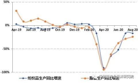 圖2:印度2019-2020財(cái)年以來紡織品和服裝生產(chǎn)月度同比增速