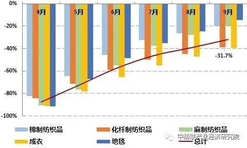 根據(jù)印度商業(yè)和工業(yè)部數(shù)據(jù),2020年4月,印度紡織品服裝出口額同比大幅萎縮87.5%,此后出口降幅逐月收窄,9月當(dāng)月紡織品服裝出口額同比增長10%,是本財(cái)年(印度2020-2021財(cái)年從4月1日開始)月度出口額首次實(shí)現(xiàn)正增長,累計(jì)出口額則仍未扭轉(zhuǎn)負(fù)增長態(tài)勢。2020年4~9月,印度共計(jì)出口紡織品和服裝109.7億美元,同比減少31.7%。從產(chǎn)品類別來看,占印度紡織行業(yè)出口總額43.6%的服裝出口降幅最大,4~9月印度共向全球出口服裝47.8億美元,同比減少39.3%;化纖制紡織品(占印度紡織品服裝出口總額13.2%)出口下降也較為明顯,4~9月出口額同比減少38.7%;棉制紡織品(出口占比為36.6%)和地毯(出口占比為5.4%)出口降幅相對較低,出口額同比分別減少19.5%和14.4%。受停工減產(chǎn)、出口下滑影響,印度紡織行業(yè)生產(chǎn)也大幅降速,根據(jù)印度統(tǒng)計(jì)和計(jì)劃執(zhí)行部數(shù)據(jù),2020年4月,印度紡織品和服裝生產(chǎn)降幅一度達(dá)到90.8%和94.1%,由于疫情嚴(yán)重程度未見緩解,目前生產(chǎn)仍未恢復(fù)增長且有再度放緩之勢。