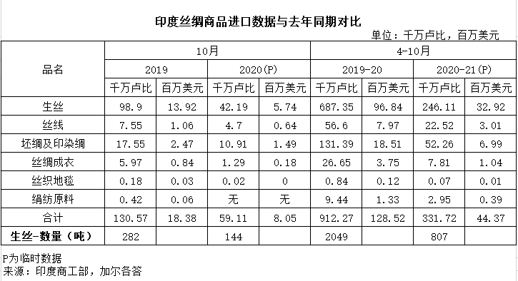 印度絲綢商品2020年10月進口數(shù)據(jù)與去年同期對比