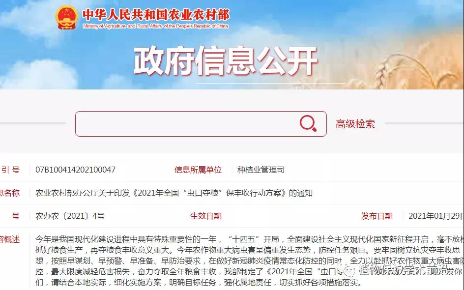 據(jù)全國農(nóng)作物病蟲測報網(wǎng)監(jiān)測和專家會商分析,2021年小麥、水稻、玉米等糧食作物重大病蟲害呈重發(fā)態(tài)勢,預(yù)計全國發(fā)生面積21億畝次,同比增加14%,對70%以上的產(chǎn)區(qū)構(gòu)成風(fēng)險,需及時采取有效防控措施,努力減輕災(zāi)害損失。