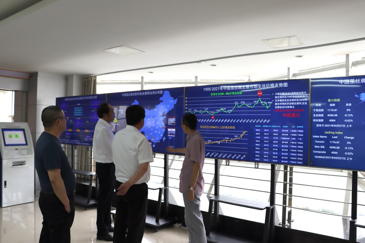 2021年5月27日上午,海安市委書記于立忠,海安政協(xié)副主席、黨組副書記盧忠平、鑫緣繭絲綢集團董事長儲呈平等領(lǐng)導(dǎo)一行蒞臨中國繭絲綢交易市場考察調(diào)研繭絲綢產(chǎn)業(yè)發(fā)展情況。市場總經(jīng)理劉卓明對于立忠書記一行的到來表示熱烈歡迎,并詳細(xì)介紹了市場平臺的功能、作用及市場網(wǎng)上交易、供應(yīng)鏈金融、大宗商品新零售等服務(wù)內(nèi)容,還就如何更好地與海安繭絲綢產(chǎn)業(yè)合作進行了深入交流。市場朱雪鳳副總經(jīng)理、徐錚副總經(jīng)理參加了交流探討。
