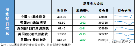 【1】WTI主力原油期貨收跌1.71美元,跌幅2.62%,報(bào)63.5美元/桶;布倫特主力原油期貨收跌1.78美元,跌幅2.61%,報(bào)66.45美元/桶;INE原油期貨收跌2.73%,報(bào)403元。