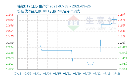 據(jù)生意社數(shù)據(jù)統(tǒng)計(jì)顯示,9月中旬錦綸市場受原料行情影響,錦綸價格大漲,上周(9月20-26日)錦綸現(xiàn)貨價格穩(wěn)中有升,行情高位持堅(jiān)。截止9月26日,江蘇地區(qū)錦綸長絲DTY(優(yōu)等品;70D/24F)報(bào)價20820元/噸,較上周價格上漲100元/噸;錦綸POY(優(yōu)等品;86D/24F)報(bào)價18325元/噸,與上周價格持平;錦綸FDY(優(yōu)等品:40D/12F)價格報(bào)22166元/噸,較上周價格上漲166元/噸。