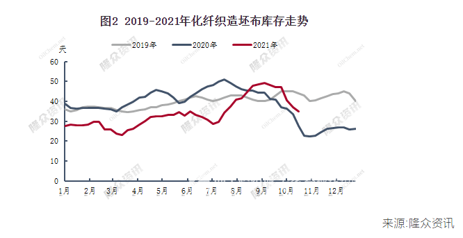 9月份華東地區(qū)限產(chǎn)以來,下游織造坯布出現(xiàn)了明顯的下滑,截止到10月14日,終端織造坯布庫存平均水平為34.89天,多數(shù)生產(chǎn)基地限電限產(chǎn)下,手內(nèi)訂單多消耗廠內(nèi)庫存為主,因此常規(guī)款坯布庫存仍處于下滑通道,但在與下游工廠溝通的時候,個別前期低價庫存消化較快的工廠開始產(chǎn)生強烈憂慮,雖然低價成本坯布在“金九銀十”、滌絲價格漲速較快、限產(chǎn)等因素支撐下消化較快,使其資金緊缺現(xiàn)象有一定緩解,所以這波上漲中也補一定原料,但是,以目前的開工負(fù)荷來算,這波原料足以支撐2個月時間,再加上市場純滌面料漲幅較小,所以以目前原料價格核算成本并無利潤可圖,故后面暫無繼續(xù)追漲考慮。綜上來看,近一個月限電限產(chǎn)使得下游織造坯布下滑,但利空影響也不容小覷,原料的高漲使得下游抵觸心態(tài)更加濃厚。