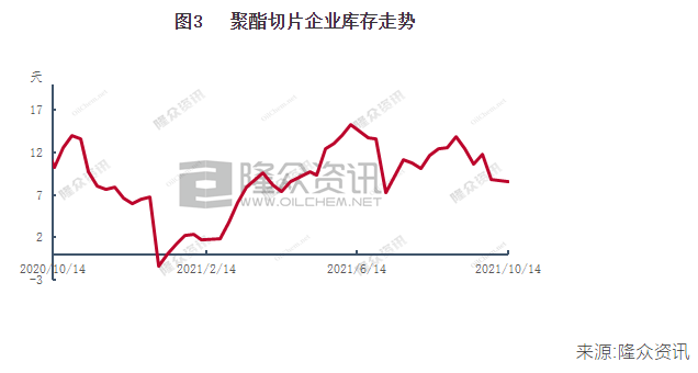 國慶假期后,聚酯切片企業(yè)周內(nèi)產(chǎn)銷持續(xù)放量,看漲情緒之下,下游工廠、貿(mào)易商紛紛補倉,但不少切片企業(yè)反饋,在盤面價差合適的情況下,期現(xiàn)貿(mào)易情緒較為高漲,尤其是切片超7300元/噸之后,下游切片紡工廠基本上處于觀望狀態(tài),在月中之后,產(chǎn)銷回歸清淡,換而言之,切片企業(yè)庫存近期雖然相對穩(wěn)定,但實際則是庫存轉(zhuǎn)移。目前,切片紡民用絲、工業(yè)絲、薄膜工廠原料庫存處于偏高位置,透支后期需求現(xiàn)象明顯。