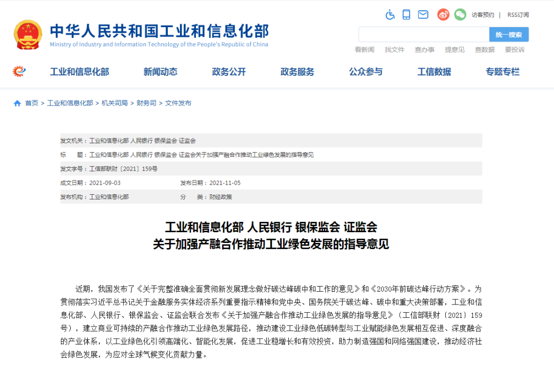 為貫徹落實習(xí)近平總書記關(guān)于金融服務(wù)實體經(jīng)濟系列重要指示精神和黨中央、國務(wù)院關(guān)于碳達峰、碳中和重大決策部署,工業(yè)和信息化部、人民銀行、銀保監(jiān)會、證監(jiān)會聯(lián)合發(fā)布《關(guān)于加強產(chǎn)融合作推動工業(yè)綠色發(fā)展的指導(dǎo)意見》(工信部聯(lián)財〔2021〕159號),建立商業(yè)可持續(xù)的產(chǎn)融合作推動工業(yè)綠色發(fā)展路徑,推動建設(shè)工業(yè)綠色低碳轉(zhuǎn)型與工業(yè)賦能綠色發(fā)展相互促進、深度融合的產(chǎn)業(yè)體系,以工業(yè)綠色化引領(lǐng)高端化、智能化發(fā)展,促進工業(yè)穩(wěn)增長和有效投資,助力制造強國和網(wǎng)絡(luò)強國建設(shè),推動經(jīng)濟社會綠色發(fā)展,為應(yīng)對全球氣候變化貢獻力量。
