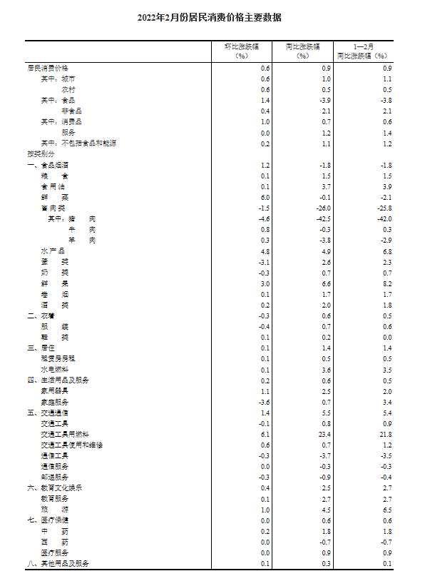 2022年2月份,全國(guó)居民消費(fèi)價(jià)格同比上漲0.9%。其中,城市上漲1.0%,農(nóng)村上漲0.5%;食品價(jià)格下降3.9%,非食品價(jià)格上漲2.1%;消費(fèi)品價(jià)格上漲0.7%,服務(wù)價(jià)格上漲1.2%。1--—2月平均,全國(guó)居民消費(fèi)價(jià)格比上年同期上漲0.9%。