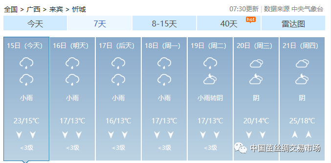 廣西忻城地區(qū)第一批春繭今日繼續(xù)小規(guī)模上市,價格一般在44-47元/公斤,按質論價,毛折據(jù)反映了解在8.5左右,上市量較昨日有所增加。忻城地區(qū)接下來幾日天氣以陰雨為主,預計對蠶繭的產(chǎn)質量指標有一定影響。