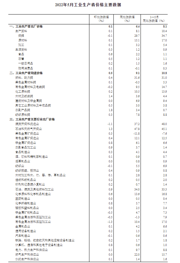 2022年5月份,全國工業(yè)生產(chǎn)者出廠價(jià)格同比上漲6.4%,環(huán)比上漲0.1%;工業(yè)生產(chǎn)者購進(jìn)價(jià)格同比上漲9.1%,環(huán)比上漲0.5%。1—5月平均,工業(yè)生產(chǎn)者出廠價(jià)格比去年同期上漲8.1%,工業(yè)生產(chǎn)者購進(jìn)價(jià)格上漲10.8%。