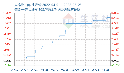 根據(jù)生意社價(jià)格監(jiān)測(cè),截止至2022年6月26日,1.2D*38mm粘膠短纖國(guó)內(nèi)地區(qū)出廠報(bào)價(jià)為15660元/噸,價(jià)格穩(wěn)定。人棉紗價(jià)格處高位,穩(wěn)中有升,(30S,環(huán)錠紡,一等品)出廠均價(jià)為19233元/噸,較上周價(jià)格上調(diào)60元/噸。