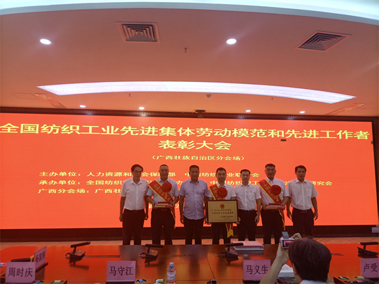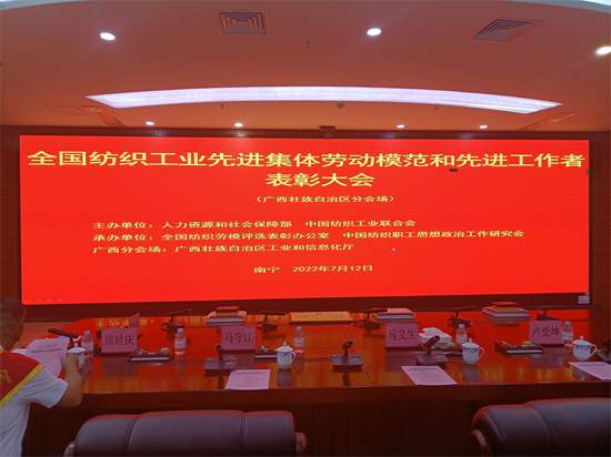 7月12日,全國紡織工業(yè)先進集體、勞動模范和先進工作者表彰大會廣西分會場會議在南寧隆重舉行,廣西壯族自治區(qū)工業(yè)和信息化廳馬義生總工程師、紡織醫(yī)藥處楊富剛處長、離退休人員工作處曾祥平處長等領(lǐng)導出席會議,并為兩位全國紡織工業(yè)勞動模范廣西桂華絲綢有限公司盧受坤董事長、廣西江緣繭絲綢有限公司周時慶總經(jīng)理頒發(fā)獎牌、證書和勞模大典紀念冊。廣西分會場會議由廣西壯族自治區(qū)繭絲綢協(xié)調(diào)辦公室楊富剛主任主持,藍旭鵬副主任、梁維佳工程師、廣西繭絲綢行業(yè)協(xié)會肖雪峰秘書長以及企業(yè)代表20多人出席今天的廣西分會場表彰大會。