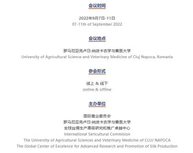 第26屆國際蠶業(yè)委員會大會將于2022年9月7日至11日在羅馬尼亞克盧日·納波卡農學與獸醫(yī)大學舉行。大會主題為“蠶業(yè)科技——種桑養(yǎng)蠶新概念”。國際蠶業(yè)委員會大會每三年舉行一次,是一項專門致力于蠶桑和絲綢行業(yè)的國際論壇。會議提供了蠶??茖W和技術的進展情況、該領域的知識體系,以及當前全球絲綢所處的商業(yè)環(huán)境。大會為從事桑蠶和其它蠶品種、宿主植物、蠶繭后加工技術、生物技術、養(yǎng)蠶管理經濟、染紗、絲綢貿易、加工、推廣、市場等領域的科學家、大學教師、科研院所研究員和學生等提供了一個互動、共享和交流進展的機會。