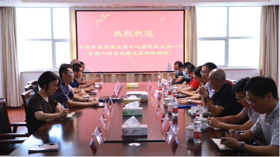 7月21日上午,中國纖維質(zhì)量監(jiān)測中心主任閻思進、監(jiān)測二處副處長羅俐,浙江省纖維質(zhì)量檢測中心主任徐勤,湖州市質(zhì)量技術監(jiān)督檢測研究院院長汪小東等一行蒞臨中國繭絲綢交易市場調(diào)研。市場總經(jīng)理劉卓明,副總經(jīng)理朱雪鳳、楊桂霞,區(qū)域營銷總監(jiān)陳錦明,倉儲管理部經(jīng)理金玉顥參加了座談。