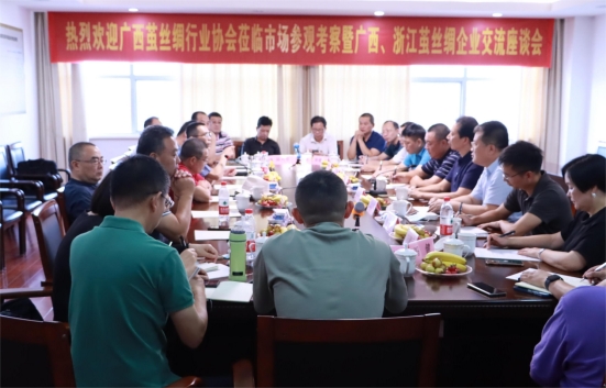 7月31日下午,中國絲綢協(xié)會副會長、廣西繭絲綢行業(yè)協(xié)會會長賴以軍一行10人蒞臨中國繭絲綢交易市場參觀考察,并與杭嘉湖地區(qū)的部分絲綢企業(yè)就行業(yè)運(yùn)行情況、未來發(fā)展趨勢等進(jìn)行了座談交流。會議由中國絲綢協(xié)會特邀副會長、浙江省絲綢協(xié)會會長吳金根主持;中國絲綢協(xié)會副會長、浙江嘉欣絲綢股份有限公司董事長周國建到會祝賀。