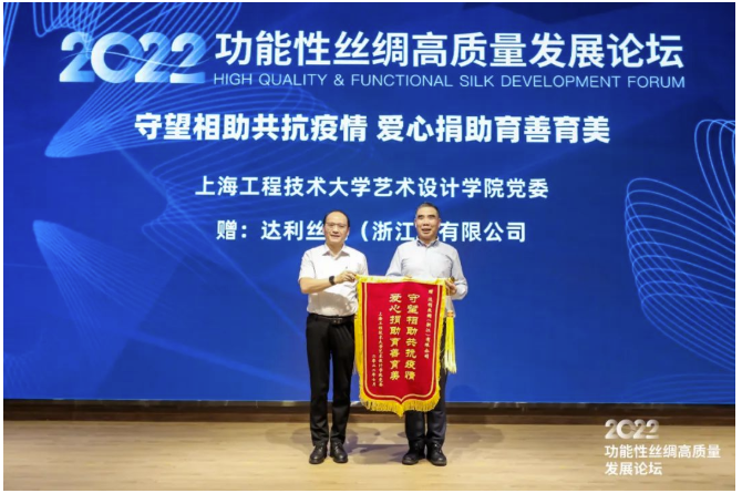 此外,上海工程技術大學藝術設計學院黨委為達利絲綢授予“守望相助共抗疫情 愛心捐助育善育美”錦旗,彰顯了達利絲綢的高度社會責任感。