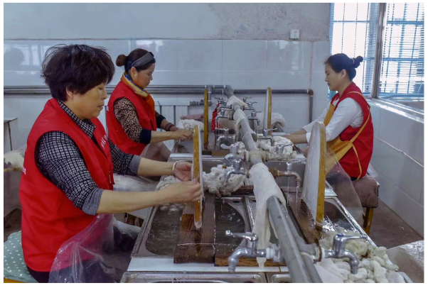 以前,靠單一的種桑養(yǎng)蠶和繅絲,綜合效益不高,蠶農(nóng)種桑養(yǎng)蠶積極性受挫。10年前,張建勇重整發(fā)展思路:圍繞“一根絲”做文章,注冊(cè)“黛夢(mèng)雅”商標(biāo),生產(chǎn)蠶絲被等系列真絲產(chǎn)品;圍繞“一樹(shù)?!弊鑫恼拢_(kāi)發(fā)以桑蠶蛹、桑葚酒、桑芽菜、桑葉茶為主的系列保健食品,向全產(chǎn)業(yè)鏈發(fā)力,增加產(chǎn)品附加值。如今,光彩公司擁有5條現(xiàn)代化的繅絲生產(chǎn)線,年生產(chǎn)能力達(dá)150噸,是徐州市最大的蠶絲生產(chǎn)企業(yè),擁有日產(chǎn)300條蠶絲被的生產(chǎn)線,是淮海經(jīng)濟(jì)區(qū)最大的蠶絲被生產(chǎn)基地。
