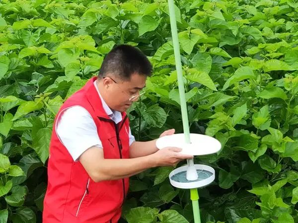 經(jīng)過深入田間調(diào)查、與蠶農(nóng)溝通交流以及結(jié)合氣候變化,科技特派員分析出此次發(fā)生桑螟危害的原因:一是暖冬使越冬桑螟存活基數(shù)大,而且桑園護(hù)理不規(guī)范,伐條桑枝留在園內(nèi),有利于桑螟躲藏越冬;二是今年桑園夏伐時桑螟已經(jīng)發(fā)育為老熟幼蟲和蛹期,無法通過夏伐淘汰桑螟幼蟲,而老熟幼蟲和蛹可以繼續(xù)發(fā)育,產(chǎn)生下一代大量危害;三是近期氣候高溫干旱,有利于桑螟蟲卵孵化,進(jìn)而危害夏伐后新長出的桑葉。針對這些原因,科技特派員分析桑螟生物學(xué)特征,推測下一批桑螟將很快會發(fā)生。為了控制桑螟為害,科技特派員利用桑螟性誘劑誘捕桑螟成蟲,以成蟲數(shù)量預(yù)測下一批桑螟發(fā)生時間,科學(xué)指導(dǎo)蠶農(nóng)抓住桑螟低齡(1-3齡)關(guān)鍵時期使用藥物高效防控。