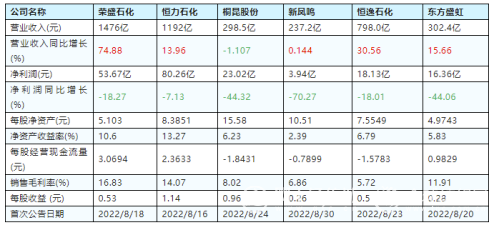 近日,各上市公司陸續(xù)發(fā)布2022年半年度報(bào)告,聚酯滌絲(民用)行業(yè)中的龍頭企業(yè)主要有六家,包括榮盛石化(002493)、恒力石化(600346)、桐昆股份(601233)、新鳳鳴(603225)、恒逸石化(000703)、東方盛虹(000301)。