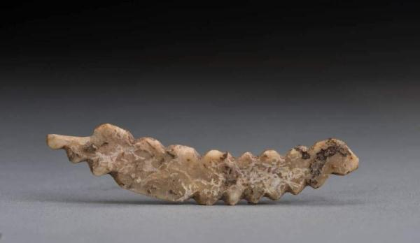 這只用野豬獠牙雕刻而成的蠶長6.4厘米,寬不足1厘米,厚0.1厘米。其造型和現(xiàn)代家蠶極為相似,背部凸起、頭昂尾翹,呈繃緊的“C”形姿態(tài),仿佛即將吐絲或正在吐絲,形神兼?zhèn)洹?/p>