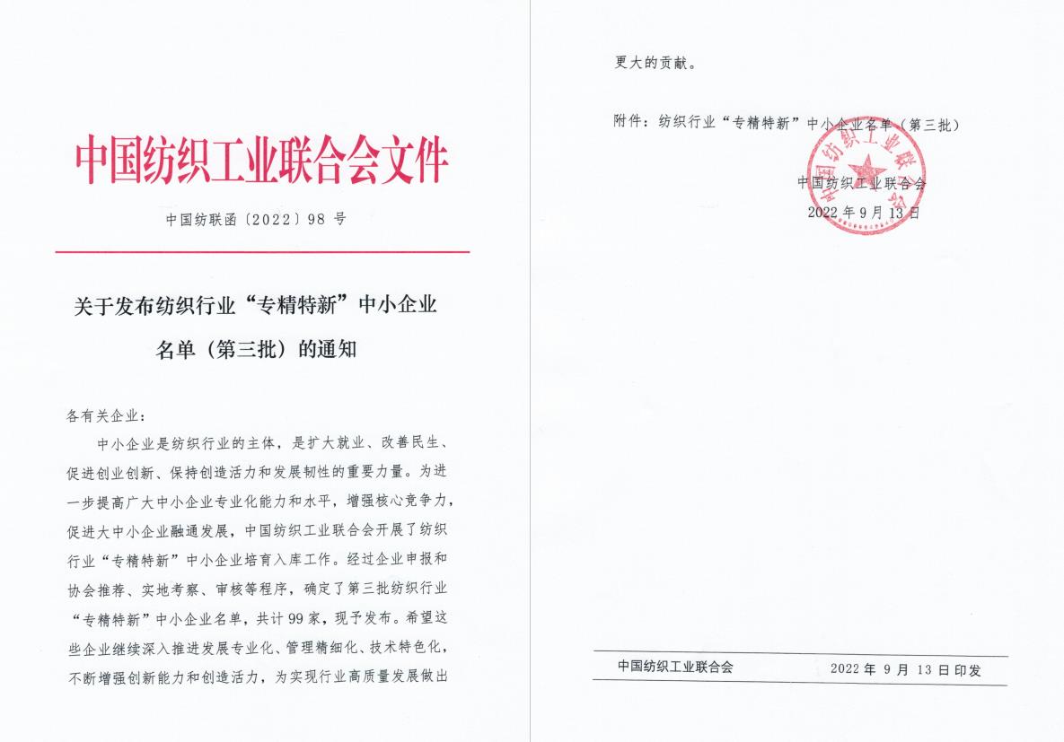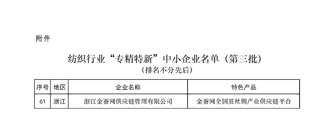 浙江金蠶網供應鏈管理有限公司成功入選紡織行業(yè)“專精特新”中小企業(yè)名單(第三批)