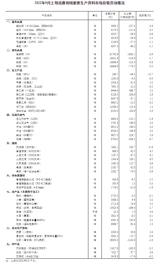 2022年9月上旬流通領域重要生產資料市場價格變動情況