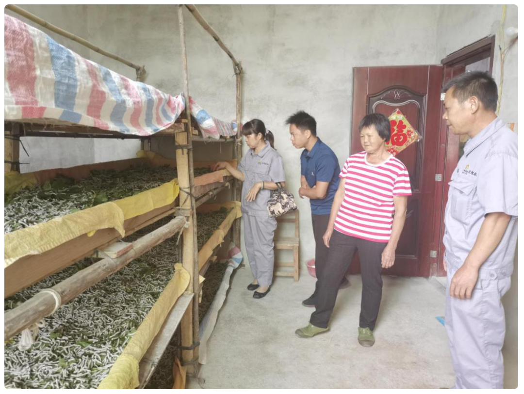 ▲蠶桑養(yǎng)殖專家現(xiàn)場(chǎng)為農(nóng)戶進(jìn)行養(yǎng)蠶技術(shù)指導(dǎo)