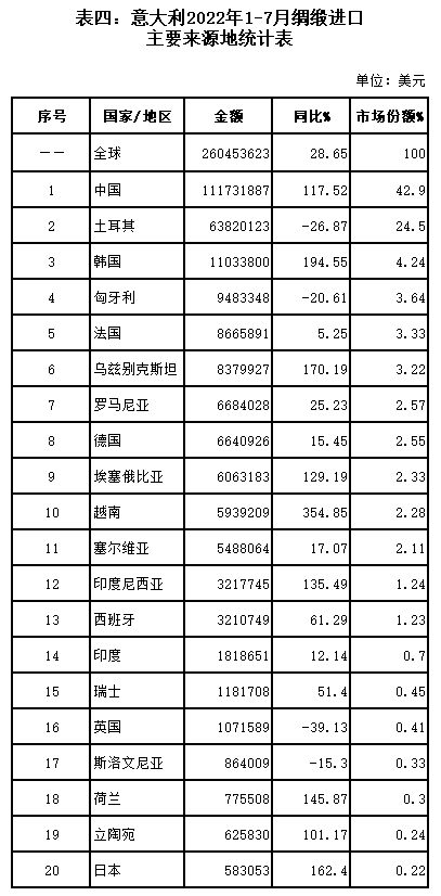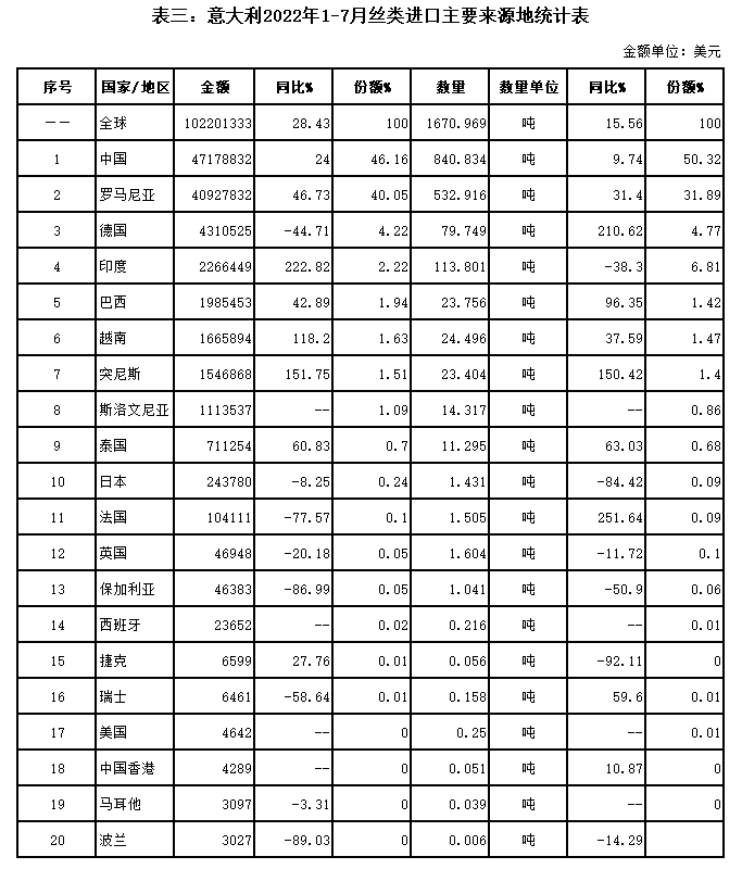 表三:意大利2022年1-7月絲類進(jìn)口主要來(lái)源地統(tǒng)計(jì)表