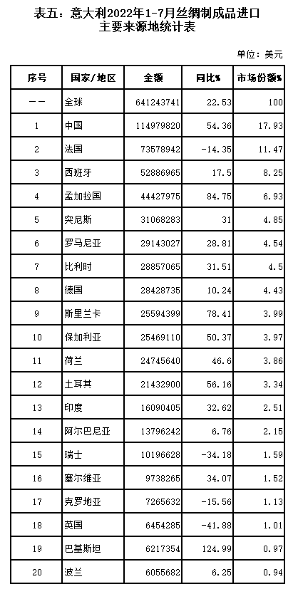 表五:意大利2022年1-7月絲綢制成品進(jìn)口主要來(lái)源地統(tǒng)計(jì)表