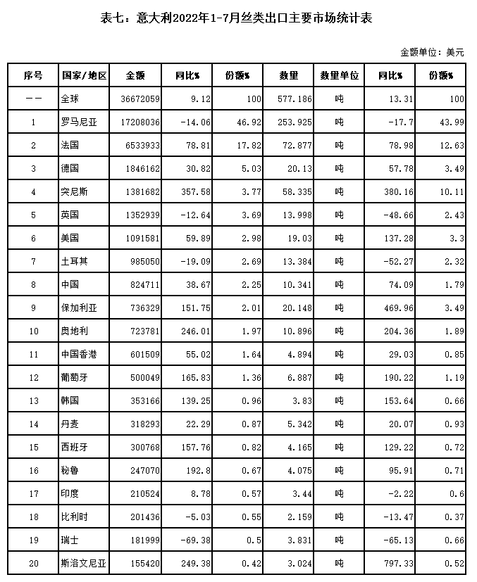 表七:意大利2022年1-7月絲類出口主要市場(chǎng)統(tǒng)計(jì)表