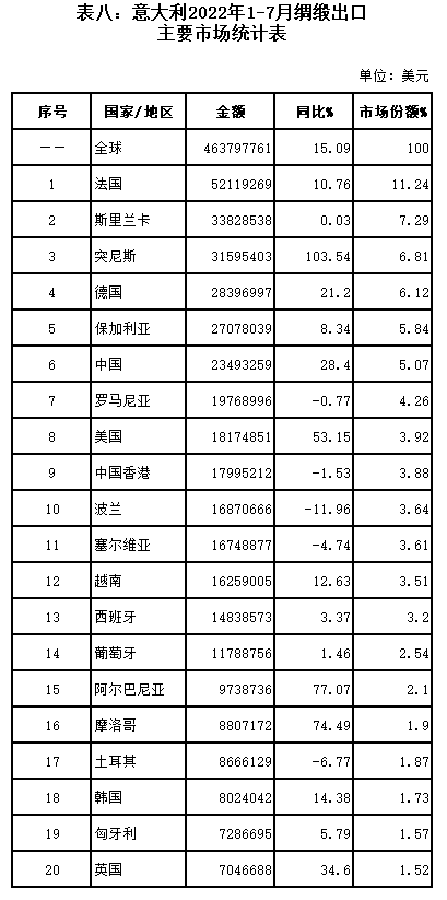 表八:意大利2022年1-7月綢緞出口主要市場(chǎng)統(tǒng)計(jì)表
