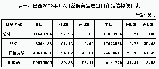 表一:巴西2022年1-8月絲綢商品進(jìn)出口商品結(jié)構(gòu)統(tǒng)計(jì)表