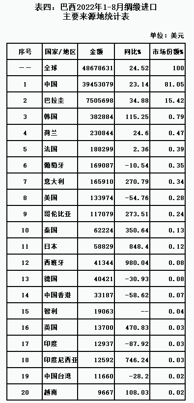 表四:巴西2022年1-8月綢緞進(jìn)口主要來源地統(tǒng)計(jì)表