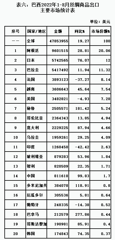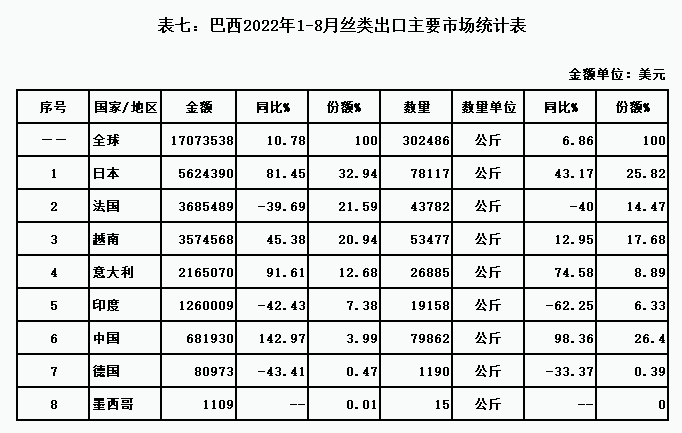 表七:巴西2022年1-8月絲類出口主要市場統(tǒng)計(jì)表