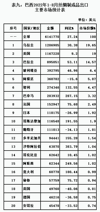 表九:巴西2022年1-8月絲綢制成品出口主要市場統(tǒng)計(jì)表