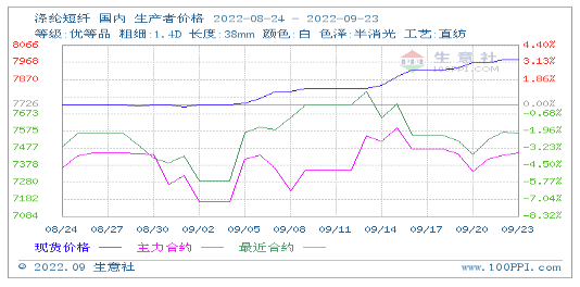 現(xiàn)貨價格:本周(9.19-9.23)國內(nèi)滌綸短纖現(xiàn)貨價格小幅上漲。據(jù)生意社價格監(jiān)測顯示,9月23日國內(nèi)滌綸短纖均價報價在7985元/噸左右,較上周上漲0.63%,比去年同期上漲11.39%。