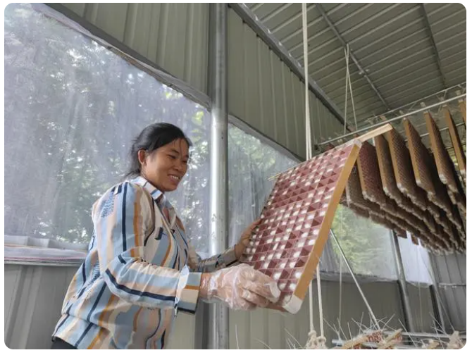 “種桑養(yǎng)蠶真是個(gè)好產(chǎn)業(yè),蠶繭可以賣錢,桑樹(shù)結(jié)的桑葚,既可食用,又可入藥和售賣;現(xiàn)在在家種桑養(yǎng)蠶,政府除了免費(fèi)提供技術(shù)指導(dǎo),還有保底收購(gòu)作保障,我們不但可以照顧家庭,而且還有不錯(cuò)的經(jīng)濟(jì)收入,我們都很樂(lè)意做?!闭谡硇⌒Q繭的蔣文真呵呵地說(shuō)道。