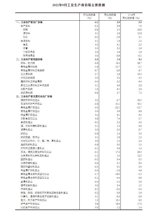 2022年9月份,全國工業(yè)生產(chǎn)者出廠價格同比上漲0.9%,環(huán)比下降0.1%;工業(yè)生產(chǎn)者購進價格同比上漲2.6%,環(huán)比下降0.5%。1—9月平均,工業(yè)生產(chǎn)者出廠價格比去年同期上漲5.9%,工業(yè)生產(chǎn)者購進價格上漲8.3%。